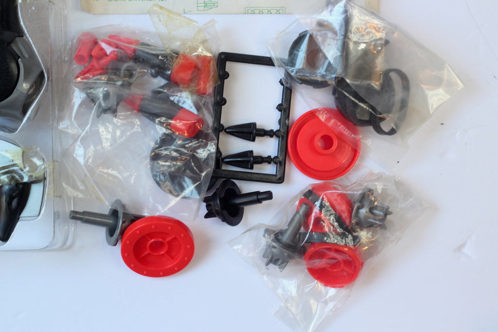 PLEASE NOTE that as far as I can tell, the red and gray wheels and missiles are the originals included with this set. There's also a set of black wheels and missiles; I don't see them in other listings of this same set, so I'm not sure where they come from. They seem to be a bonus. Please note that one of the black wheels and axels and two of the black missiles are missing.