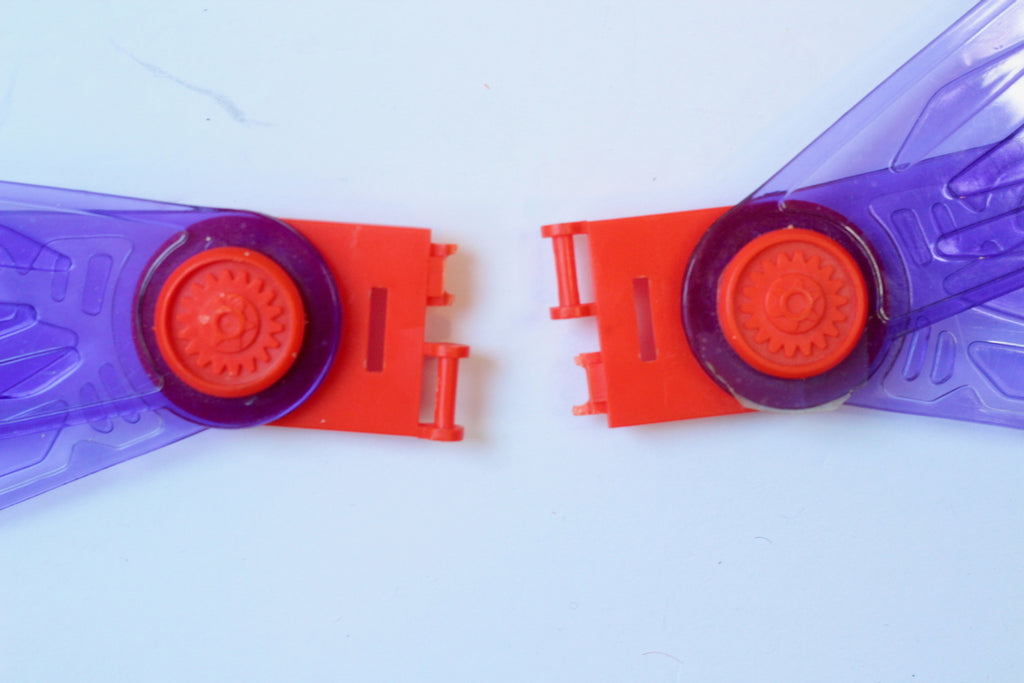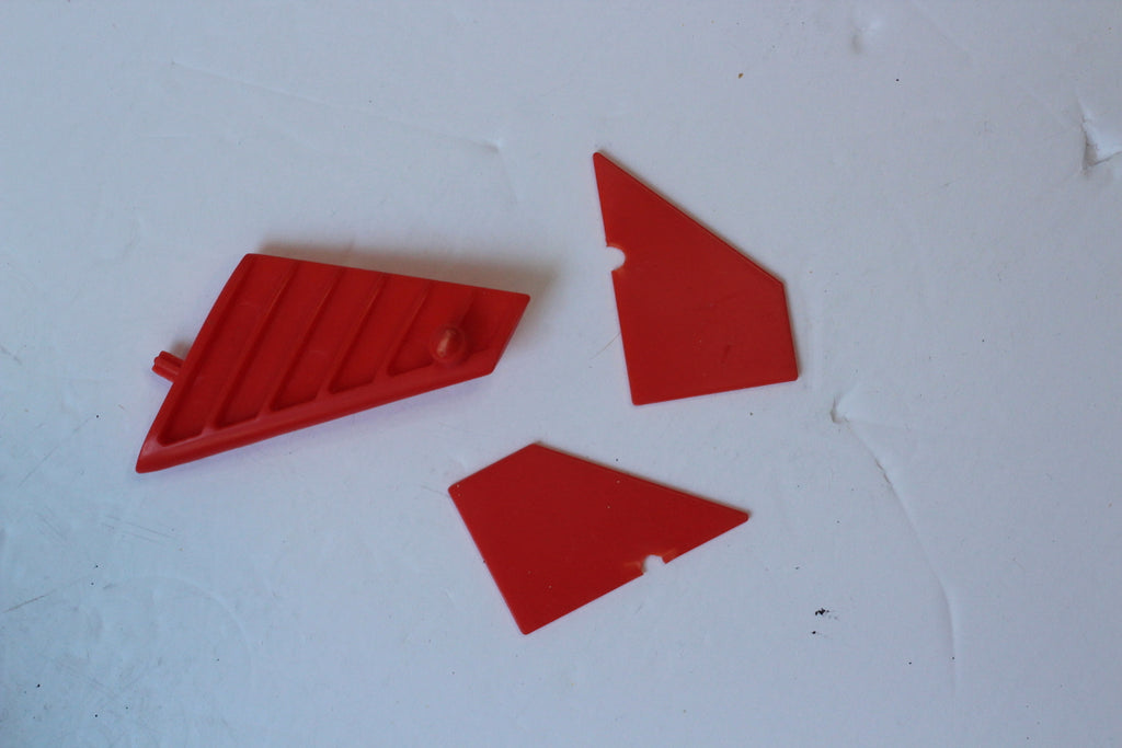 The toy's complete with all original parts in well used condition. The side fins have broken off of the rear fin -- see pictures. Some parts of the hinge holding the wings together have broken off, but that doesn't seem to affect function when fully assembled and the wings flap. One of the wing parts has a crack around its base, which you can see was repaired with tape, but that also doesn't seem to affect function.